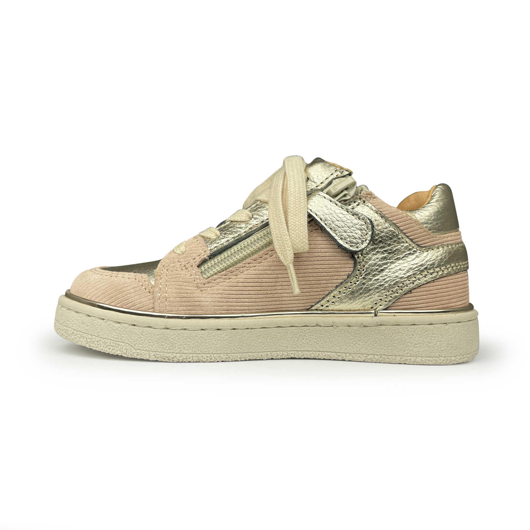 Glimlachen gegarandeerd met deze roze en platina sneaker van Babybotte! De mix van metallic platina en zachtroze corduroy maakt dit paar een echte eye-catcher. Perfect voor kinderen die van glitter houden, maar ook comfort nodig hebben tijdens het ravotten, springen of gewoon... een beetje showen