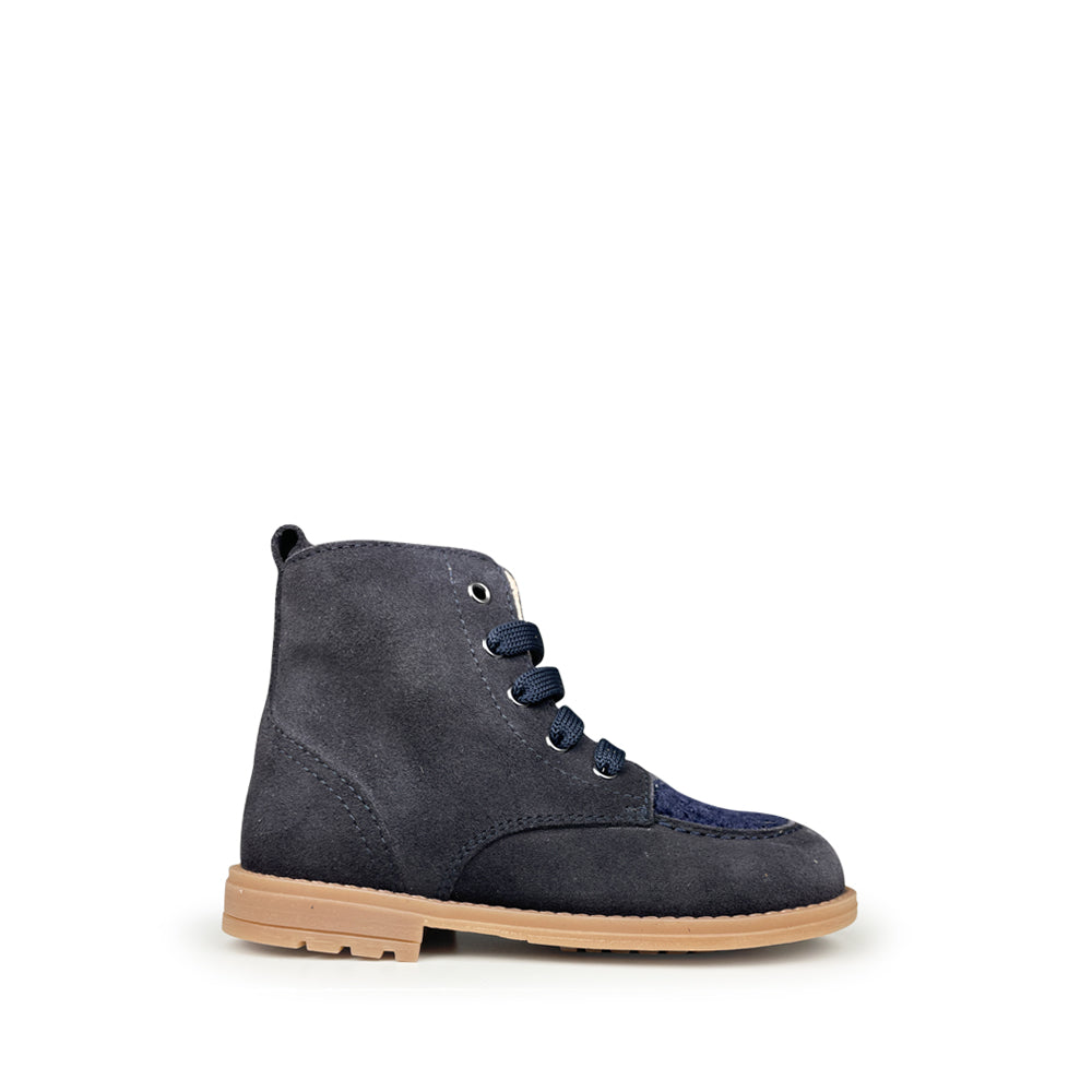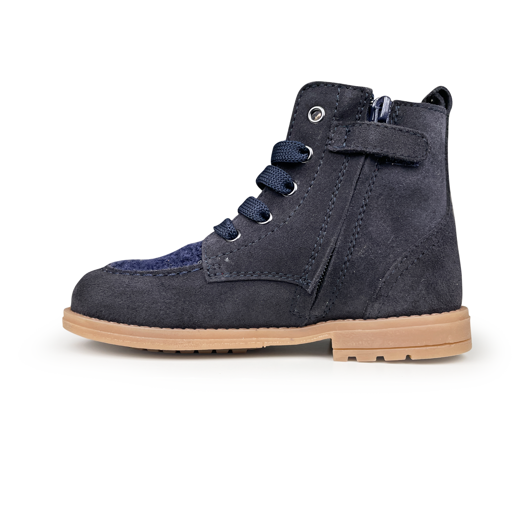 Stijlvolle schoen, goed voor vele looks. Een klassieke eerste stapschoen van het Spaanse merk Beberlis in donkerblauw leder met een wol accent op de voorkant van de schoen.