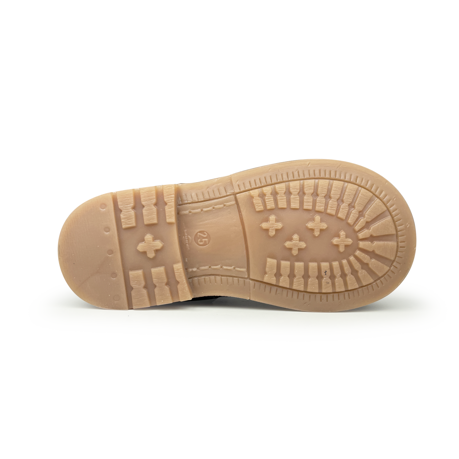 Volledig in leder, met voetbed en een donkere rubberen buitenzool. De ideale schoen voor de eerste stapjes en vele erna!